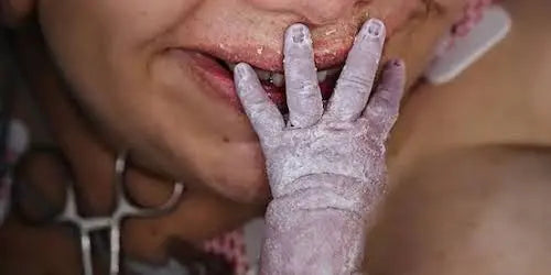 Eine Alternative zur vaginalen Untersuchung ist die Beobachtung der „purple li“. Diese rot/violette Linie erscheint zwischen dem Gesäß (vom Analrand bis zum oberen Gesäß) zu Beginn des zweiten Stadiums der Wehen und soll mit der zervikalen Dilatation und der Position des fetalen Kopfes korrelieren. (Studien haben gezeigt, dass diese Linie bei etwa 76% der Frauen in der Wehenphase vorhanden ist (21), und ihre Länge scheint ein Indikator für die Öffnung des Gebärmutterhalses und die Position des fetalen Kopfes zu sein (22).