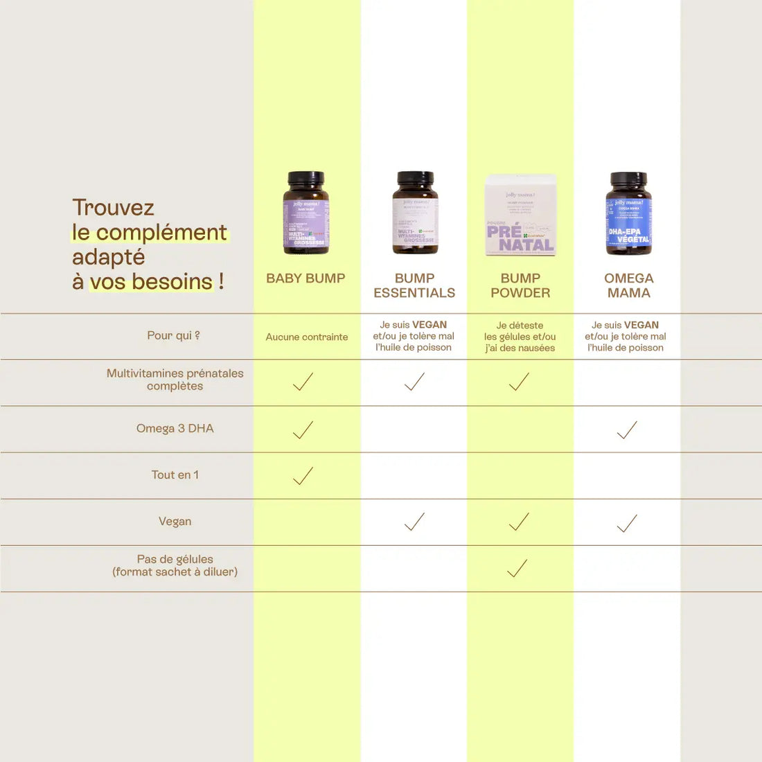 Parce que la grossesse est une période où le besoin en plusieurs nutriments augmente (ANSES), nous avons créé Baby bump, le complément alimentaire ultra complet 3 en 1 (multivitamines, DHA, choline).