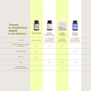 Si malgré tout vous ne digérez pas l'huile de poisson, vous pouvez prendre notre complément Bump essentials, qui est l'équivalent de Baby bump mais sans huile de poisson ! Dans ce cas surveillez bien vos apports en DHA dans l'alimentation (poissons, oeufs) ou consommez des produits enrichis avec de l'huile de micro algue (comme la pâte à tartiner Crazy nut) ou notre complément oméga 3 grossesse Oméga Mama.