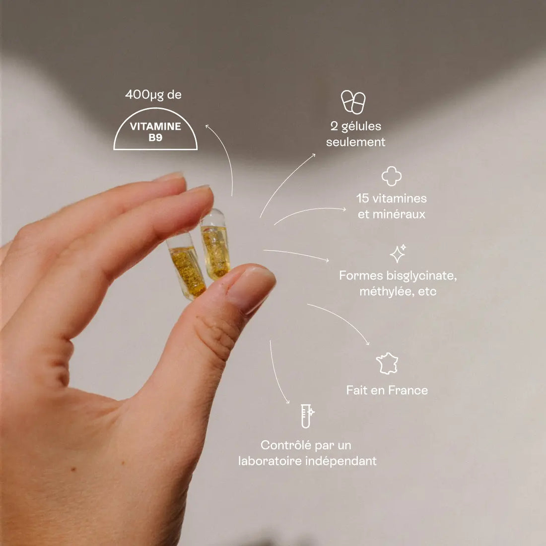 Remplace l'acide folique (vitamine B9 méthylée et brevetée Quatrefolic®).