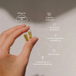 - 400 µg de folates (vitamine B9) sous forme active de 5-méthyltétrahydrofolate (Quatrefolic®) par jour, directement assimilée par l’organisme (2). Au cours de cette période périconceptionnelle, un apport insuffisant en vitamine B9 (folates) pourrait augmenter le risque d'anomalies du tube neural*.