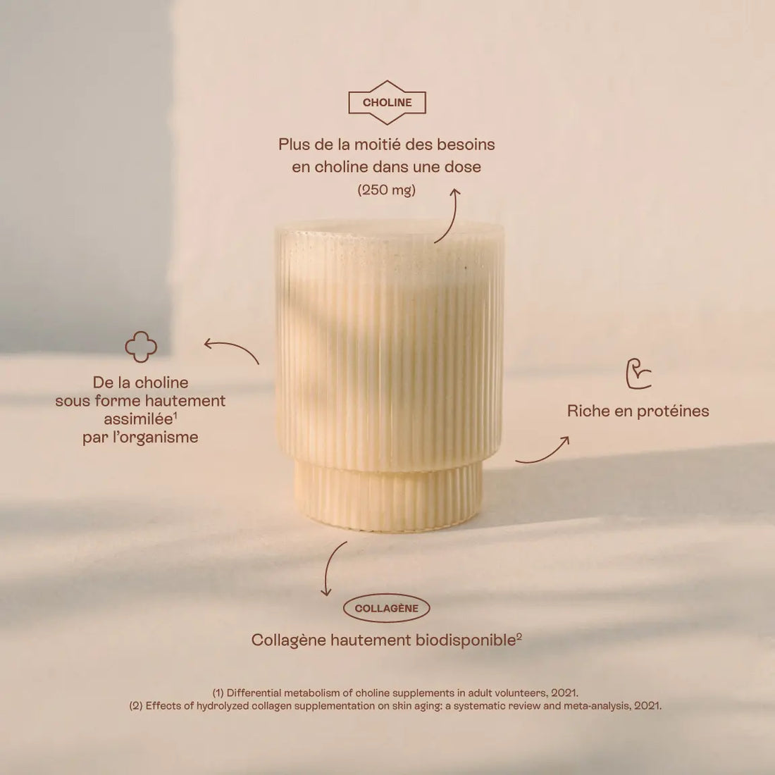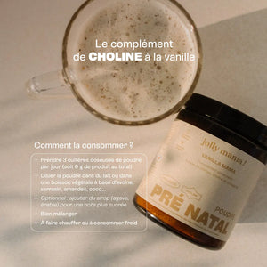 La poudre vanille à base de Vitacholine, la forme brevetée de bitartrate de choline, pour combler les besoins en choline qui augmentent pendant la grossesse et l'allaitement (ANSES). Elle contient également 3g de collagène.