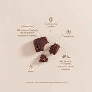 Ultra pratique avec son format en bouchées, chacune couvre 45% de vos besoins journaliers, sous une forme glycérophosphate de magnésium hautement assimilée par l’organisme*.