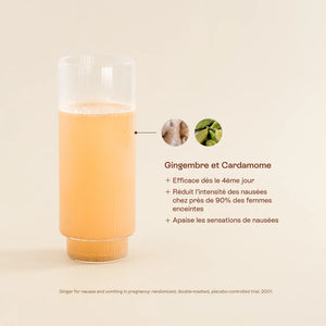 Le gingembre contribue au fonctionnement normal de l'estomac en début de grossesse. Il est reconnu pour être efficace dans le soulagement des nausées et vomissements, en particulier pendant la grossesse.