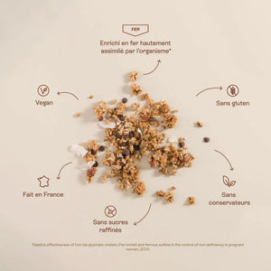 Un granola enrichi en fer, pour un apport supplémentaire au quotidien. Le besoin en fer augmente pendant la grossesse, l'allaitement et si vous avez des pertes menstruelles élevées. Il passe de 11mg par jour à 16mg par jour (1).