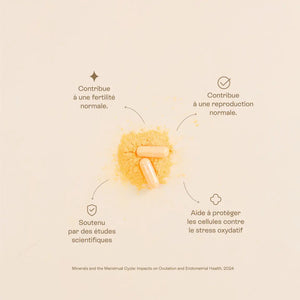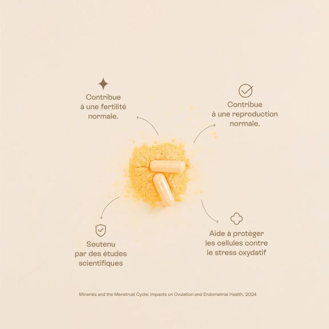 Aide à protéger les cellules contre le stress oxydatif. Plusieurs études scientifiques suggèrent un lien entre un stress oxydatif élevé et des paramètres liés à la fertilité (1).