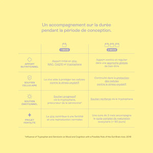 Sa formule associe du zinc, qui contribue à la fertilité normale et à la protection des cellules contre le stress oxydatif, à la N-acétyl-cystéine et à la coenzyme Q10, deux composés étudiés pour leur implication dans les mécanismes cellulaires et la gestion du stress oxydatif (1). Le L-tryptophane est un précurseur de la sérotonine (2). Ovo+ est un coup de pouce dans une approche globale en projet bébé.