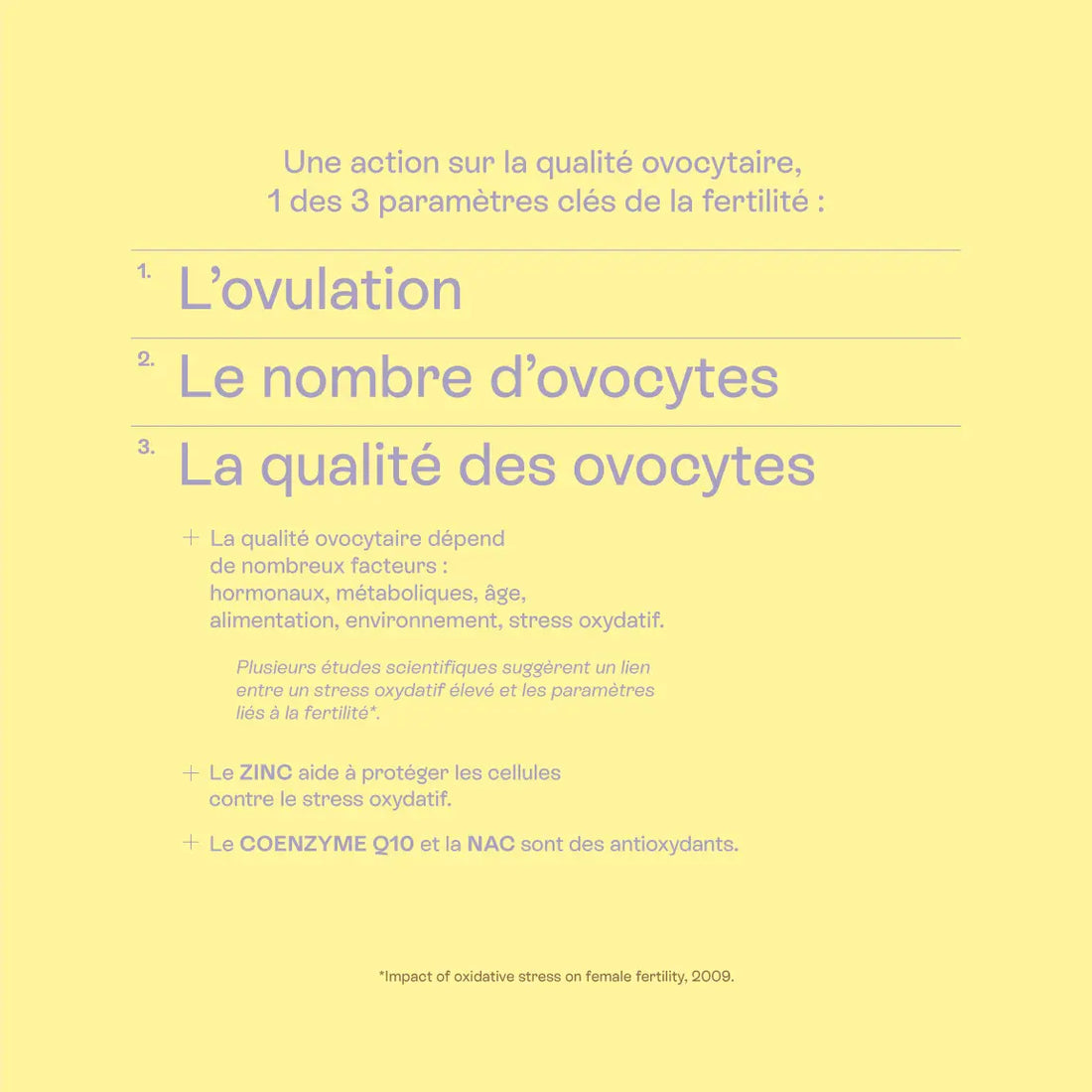 La qualité ovocytaire dépend de nombreux facteurs, notamment l’âge, l’équilibre hormonal, les habitudes de vie, l’alimentation ou encore le stress oxydatif*. Celui-ci est étudié pour son rôle potentiel dans le vieillissement cellulaire, y compris au niveau des cellules reproductrices**. Ovo+ contient du zinc, qui contribue à la protection des cellules contre le stress oxydatif.