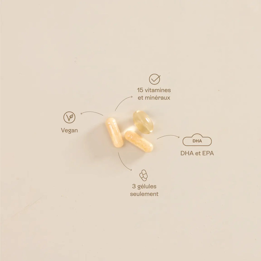 Nous avons créé le pack grossesse, une formule ultra-complète et vegan. Elle contient des nutriments essentiels comme la vitamine B9, choline, iode, etc et des oméga 3 DHA et EPA.