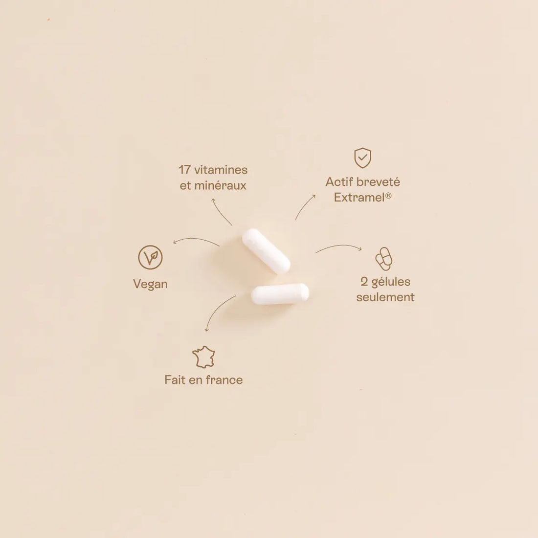 Les vitamines B2, C, E, le zinc et le sélénium contribuent à protéger les cellules contre le stress oxydatif. L’actif breveté Extramel est un extrait de melon riche en superoxyde dismutase, un puissant antioxydant.